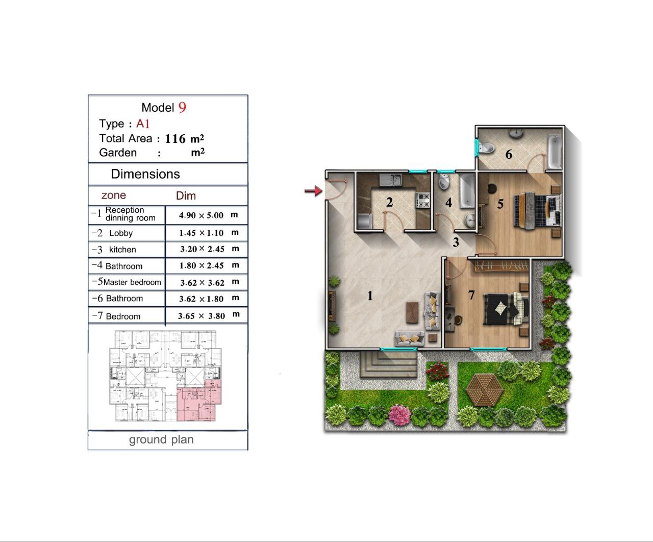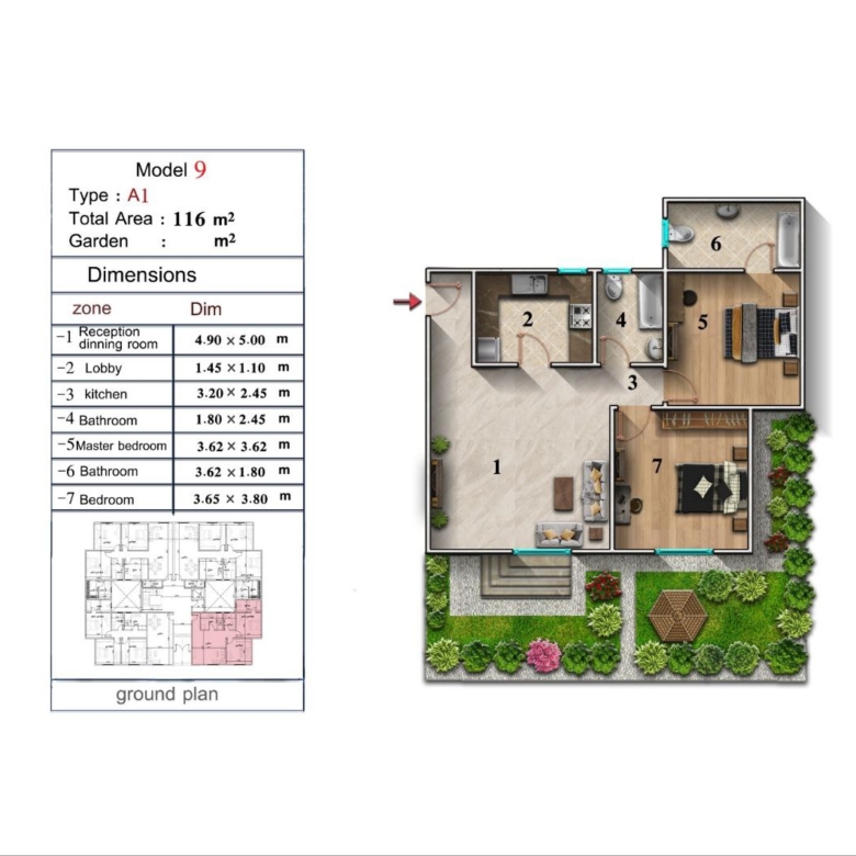المساحة: 116 م² + حديقة خاصة 38 م²