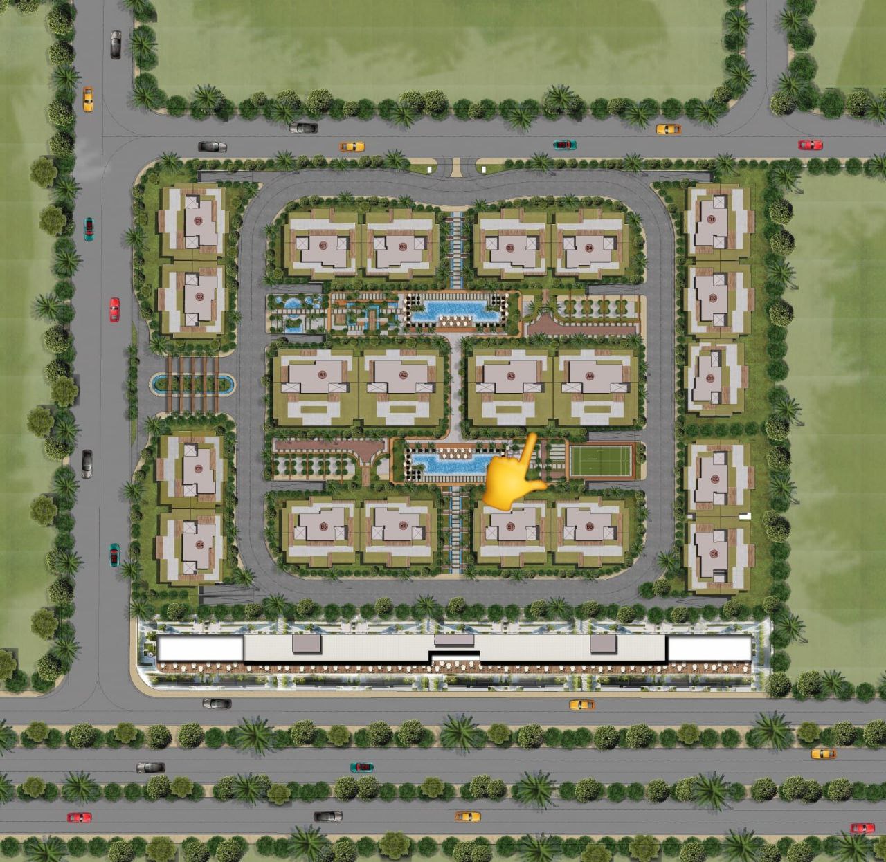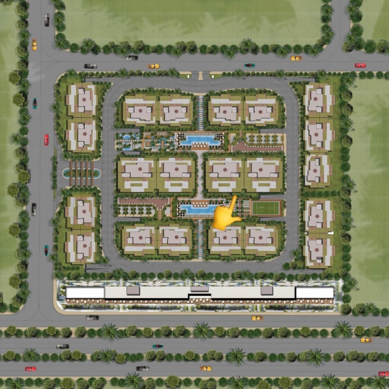 يقع الكمبوند على شارع خط 10 الرئيسي أمام الحي الثامن