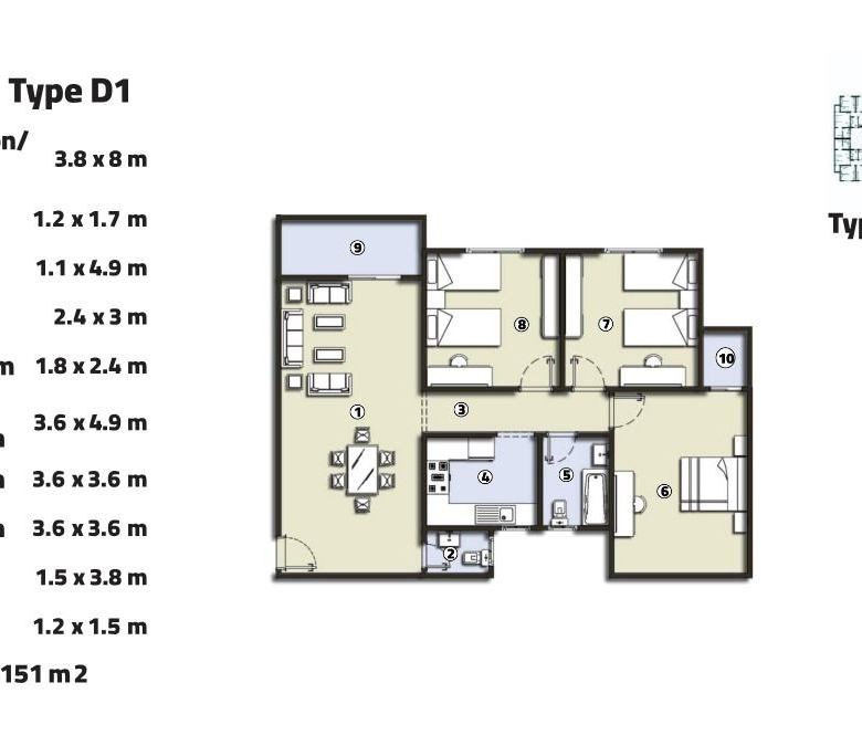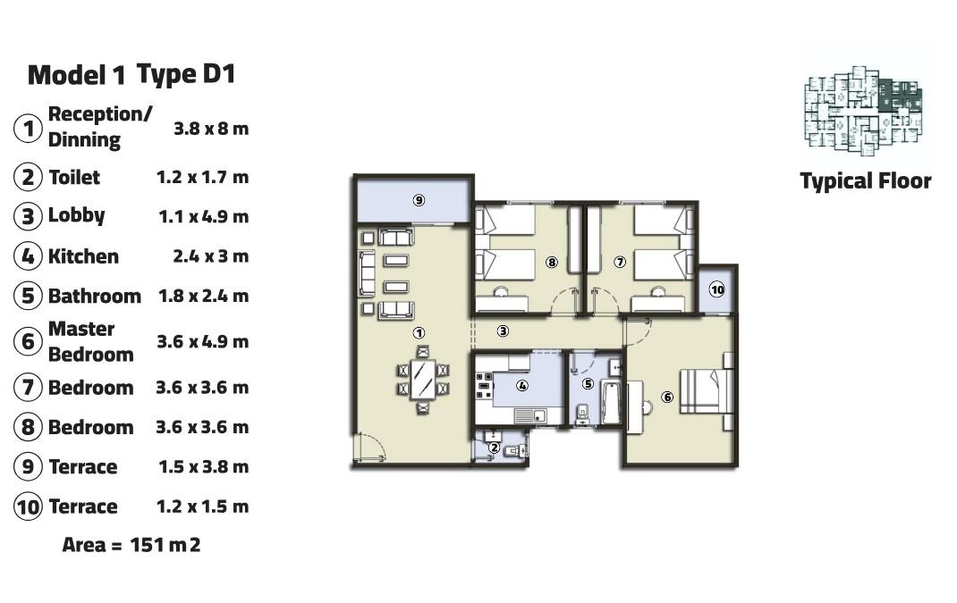 الوحدة: شقة 3 غرف – 151 م² – الدور الأول