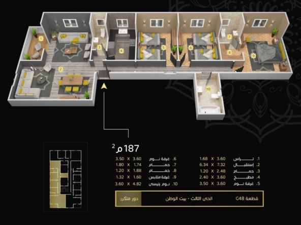 التقسيمة: 3 غرف – ريسبشن – 2 حمام – مطبخ